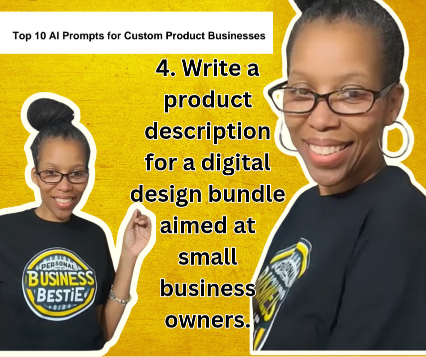 Kickstart your creativity and streamline your business with our exclusive 10 AI Prompts Cheat Sheet! Designed for solopreneurs in the custom products industry, this quick guide gives you the exact prompts you need to generate fresh ideas, craft compelling content, and drive sales. Whether you're selling tumblers, t-shirts, digital designs, or mugs, these prompts will help you elevate your marketing game in no time. Grab your free cheat sheet today and get a sneak peek into how AI can transform your business.